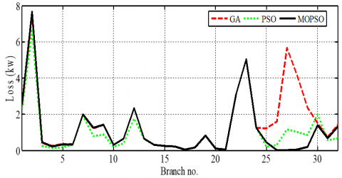 In the Table 4, the results of optimization have been presented by these three algorithms. According to the results of Table 4, in the case of optimization by genetic algorithm, the bus 33 with a capacity of 1.32 MW and the bus 12 with a capacity of 845 kW are proposed for the installation of distributed generation sources. Capacitor banks with a capacity of 845 kVar at bus 8 and 710 kVar at bus 3 have been proposed. But if the PSO algorithm is used, the bus 15 with a power capacity of 1.125 MW and the bus 32 with a power of 885 kW for installation of distributed generations and the bus 27 with the capacity of 2740 kVar and bus 18 with a capacity of 1120 kVar for the installation of capacitive banks have been proposed to minimize the objective function. While the MOPSO algorithm has selected buses 26 and 12 as selected buses for the installation of distributed generation with capacities of 932 and 1210 kW, as well as capacitor banks with the capacitor 720 and 850 kVar for buses 27 and 30. In this case, the magnitude of the ohmic losses of the distribution system for GA, PSO and MOPSO algorithms was 76.9, 63.7, and 47.3 kw, respectively. The value of the voltage function for the GA algorithm is equal to 0.153, for the PSO algorithm is 0.167 and for the MOPSO algorithm is equal to 0.132. The total cost of the system for the case of active and reactive sources is set at \$ 694 for active GA and \$ 694 for the GA algorithm, \$ 631 for the PSO algorithm and \$ 540 for the MOPSO algorithm. According to Figure 16, it can be said that the value of the most lines of loss in the case of using the MOPSO algorithm is less than two other algorithms. In the following, in Figure 17, the voltage range of each of 33 buses of 33-bus network has been shown for three algorithms.