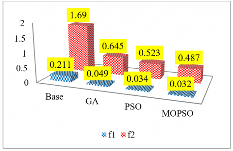In Figure 18, f1 shows the value of the loss function and f2 the value of the voltage function. As shown in the figure, after the installation of distributed generation and capacitor banks in the studied system, the losses are up to 75% and the voltage function has been improved up to more than 93%. The loss of the minimum value of the loss function and voltage have been obtained for the MOPSO algorithm and this algorithm has managed to keep these two functions at its minimum.