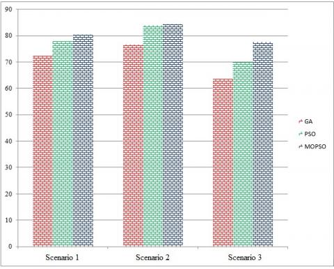 The percentage of loss reduction in the first scenario for three GA, PSO and MOPSO algorithms was calculated to be 72.3, 77.9, and 80.4, respectively while these values in the second scenario for the three algorithms are 76.7, 83.9 and 84.3, respectively. The reason for the decrease in the losses in the first scenario compared to the second scenario is the objective function defined for it. In the first scenario, in addition to reducing losses, the voltage profile was also improved which has prevented further loss. In the third scenario, the loss reduction percentage for these three algorithms is 63.55, 69.81 and 77.58, respectively.