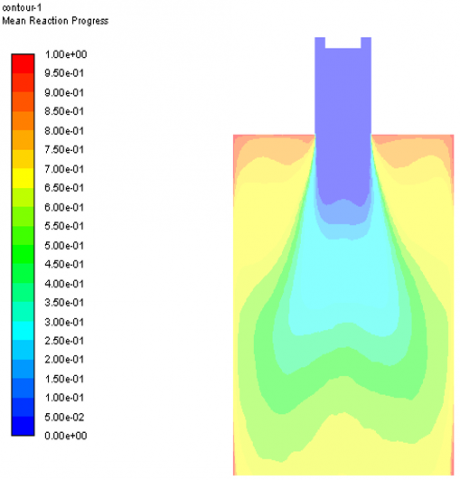 The premixed combustion model considers the reacting flow field to be divided into regions of burnt and unburnt species, separated by the flame sheet. Reaction progress variable denoted by “c” represents burnt mixture when equals to 1 and unburnt mixture when equal to 0. Values between 0 and 1 implies flames front spent some time in burnt state and some in unburnt state.