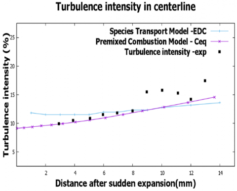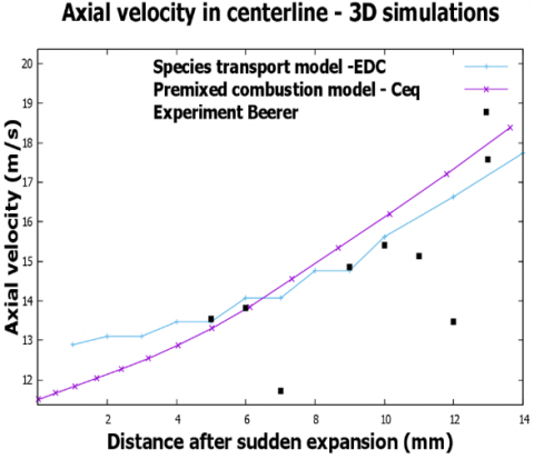 Figure 5 Shows simulations results for axial velocity along the centerline. Cheng and Littlejohn [13] calculated the turbulent flame speed using the correlation: