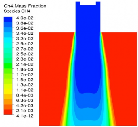A qualitative comparison between CH4 mass fraction in EDC model using LES and EDC using RANS is shown in Figure 7 and contour of mass fraction of CH4 for RANS from literature. The former is conducted in this work, the latter are results of the work of Neumayer [8]. LES shows a superior capability to predict the flame shape and species distribution compared to RANS.
