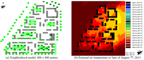 Figure 10 shows the analysis made in ENVI-met, and in Figure 10b external air temperature at 5pm of August 7th, 2015 (the hottest day for the 2014 and 2015) have been mapped. It is possible to see that the minimum temperatures are about 34.5°C and are located in the inner courtyards of the buildings and where there are green areas.