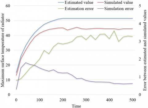 Figures 9 and 10 display the temperature drop and error curves under the MOSFET power loss of 250W and 100W, respectively. Comparing the temperature rise and temperature drop curves under the same power loss, it can be inferred that the surface temperature of the cooling module peaked at 53.2℃ and 47.9℃, respectively, during the temperature rise after the steady-state heat balance; the lower bounds of the maximum surface temperature of the cooling module stood at 44.9℃ and 45.3℃, respectively, during the temperature drop. As shown in Figures 9 and 10, under the two power losses, the estimated maximum surface temperature of the cooling module was basically the same as the simulated results, with a calculation error within 5%. The maximum temperature difference between estimated and simulated results was about 2.5℃.