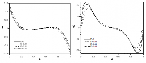 To validate the elaborated numerical code, our results, expressed in terms of minimum stream function, Ψmin, and average Nusselt number, $\overline{N u}$, for both imposed temperature and flux cases, are compared with previous researches with or without elasticity effect. Hence, as can be seen from Table 2 and Figure 3 a good agreement is generally obtained.