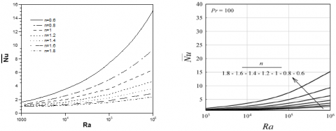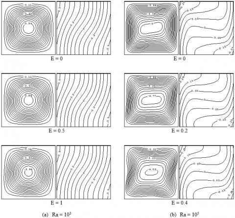 To check the mesh independency of the obtaining solution, minimum stream function value, Ψmin, and average Nusselt number, $\overline{N u}$, are presented for two fixed cases, in which the control parameters are given by: n=1, Ra =105, Pr = 30, E= 0.4 and for the second case n = 0.6, Ra = 104, Pr = 30 and E = 0.06. Several tests were made for four different grids. Results are tabulated in Table 1. For sufficient precision the uniform grid of 250x250 has been considered for the further study.