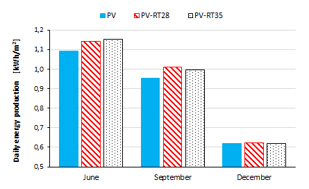 The cell temperature and electrical efficiency of the two PV-PCM units are compared with those of a conventional PV panel. In particular, the outcomes at the winter and summer solstice, and the autumn equinox have been highlighted. One of the novelties of this study consists in the possibility to takes into account variable weather conditions in the developed numerical model. The hourly values for solar irradiation, ambient temperature, and wind velocity are used as input data.