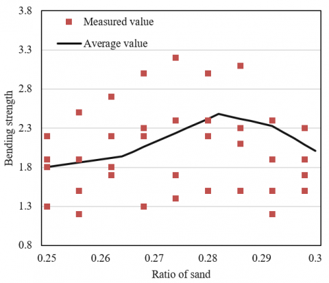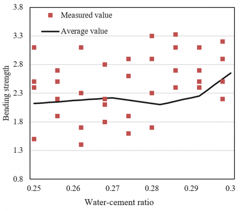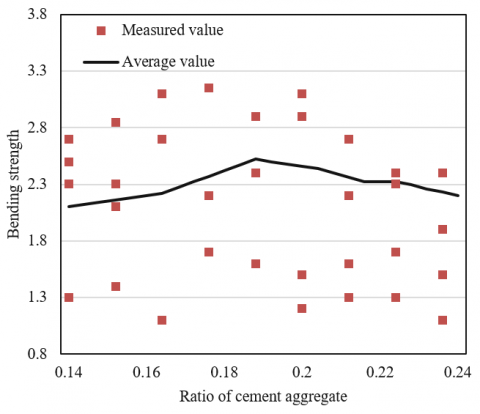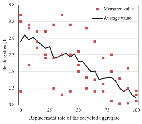 Figures 4 (a), (b), (c), and (d) respectively show the influence of a few factors (including the replacement rate of the recycled aggregate, the ratio of cement aggregate, the water-cement ratio, and the ratio of sand) on the bending strength of the recycled aggregate permeable concrete. As can be seen from the figure, as the replacement rate of recycled aggregate increases, the bending strength of the recycled aggregate permeable concrete shows a fluctuated decreasing trend. When the replacement rate of recycled aggregate increases from 0 to 25%, the bending strength of the concrete gradually decreases; when the replacement rate of recycled aggregate increases from 25% to 48%, the bending strength gradually increases; when the replacement rate of recycled aggregate exceeds 48%, the bending strength keeps decreasing and drops to the lowest, indicating that when the mixing ratio of the recycled aggregate is at a low level, it has a certain effect on improving the bending strength of the recycled aggregate permeable concrete; however, when the mixing ratio of the recycled aggregate is at a high level, factors such as the ratio of the cement aggregate, the water-cement ratio, and the ratio of sand would bring greater adverse effects, so the improvement of the bending strength is not obvious. If the replacement rate of recycled aggregate is kept at a fixed value, then the bending strength of the concrete is less affected by the ratio of cement aggregate, the water-cement ratio, and the ratio of sand, and the fluctuations are not obvious.