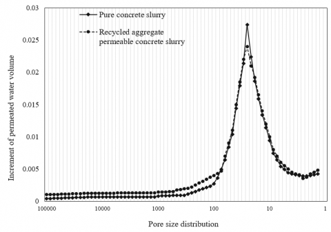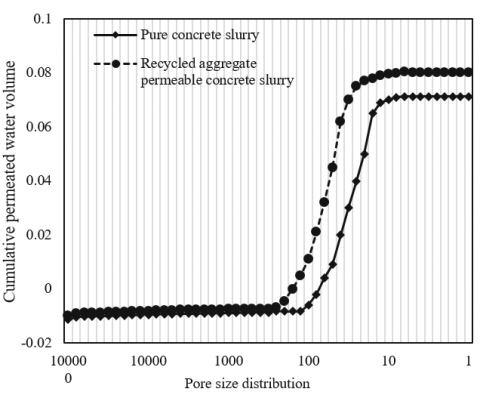 Figure 5 shows the curves of the cumulative permeated water volume and the increment of permeated water volume. As can be seen from the figure, the porosity and total pore volume of the concrete test pieces were relatively small. After the recycled aggregate was added, the total porosity and average pore size of the concrete increased, but the proportions of harmful pores and very harmful pores increased significant as well. This is because the recycled aggregate is mixed into the concrete slurry as a waterproofing agent, after hydrolysis and condensation reactions, the generated hydrophobic groups would make the surface of the concrete slurry hydrophobic, and slow down the hydration of the concrete, resulting in an obvious increase in the proportion of harmful pores, and this phenomenon is consistent with the results of the test on the influence of various factors on the bending strength of concrete, the adding of recycled aggregate significantly reduced the compressive strength of the permeable concrete. Regarding the freeze-thaw durability of the recycled aggregate permeable concrete, the hydrophobic groups brought by recycled aggregate could act as the rigid waterproof layer of the test piece so the impermeability and the overall waterproofing ability of the test piece have been improved, water can hardly penetrate into the inside of the concrete, which would greatly reduce the degree of freeze-thaw deterioration of the concrete.