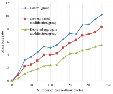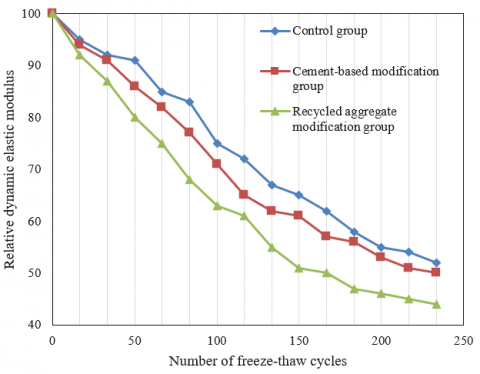 With the increase of the number of freeze-thaw cycles, the mass loss of the three groups of test pieces increases continuously, while the relative dynamic elastic modulus decreases gradually. Among the three test groups, the change of the test pieces of the recycled aggregate permeable concrete was the smallest. When the number of freeze-thaw cycles reached about 250 times, the mass loss of the test pieces of the recycled aggregate permeable concrete test pieces exceeded 36.4%, the relative dynamic elastic modulus increased by 17.1%; compared with the test pieces of the control group, the mass loss exceeded 25.9%, and the relative dynamic elastic modulus increased by 9.41%, and the freeze-thaw durability of the concrete had been significantly improved.