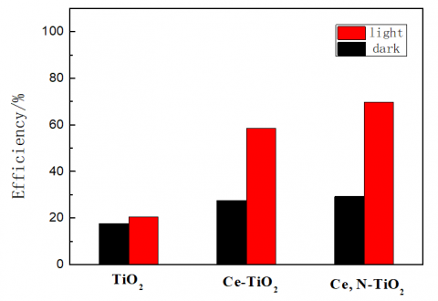 A large amount of OH [21] can be produced by the interaction of O3 and H2O. O3 is also a good electron acceptor, which can prevent the recombination of photo-generated electron-hole pair on the surface of TiO2 and improve the photocatalytic activity of Ce-N-TiO2.