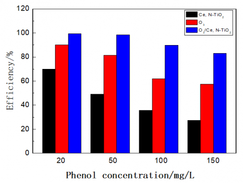 As can be seen from Figure 7, the addition of O3 can effectively improve the photocatalytic oxidation capability of Ce-N-TiO2 and expand the concentration range of the treatable phenol of Ce-N-TiO2. For phenol solution with concentration of 100 mg/L or less, the co-oxidation efficiency of O3 and Ce-N-TiO2 can reach more than 90 %. For 150 mg/L phenol solution, the oxidation efficiency can reach above 80 %.