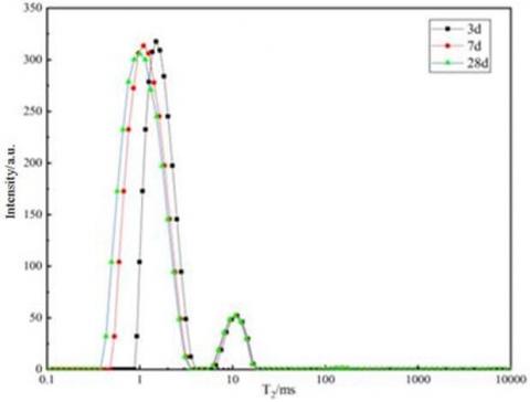 Figure 14. T2 distribution map for 28d filling materials prepared from steel slag muds ground for different durations