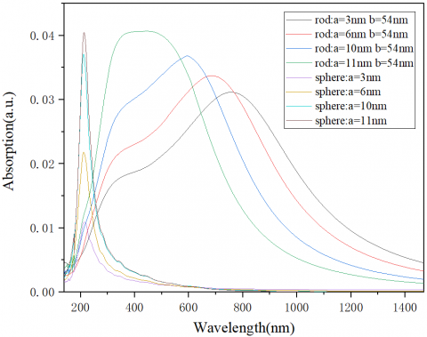 (3) According to the absorption spectra of palladium nanospheres and nanorods with the same axial length and different radii, palladium nanorods are more effective for broad-spectrum SPR tuning than palladium nanospheres.
