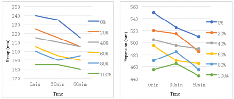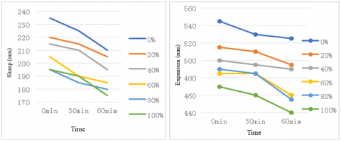 The experimental results show that the slump and expansion of C80 concrete gradually decreased with growing content of waste slurry. After the waste slurry content surpassed 60%, type I concrete had faster initial slump and 30min slump losses than type II concrete, and less stable slump change than the latter. Type II concrete exhibited greater slump and expansion than type I concrete. The findings are consistent with Franco’s conclusion [6] on how the waste slurry from mixing station affects the working performance of concrete.