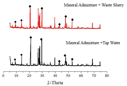 For the concrete samples prepared from fly ash and slag powder, the fly ash is not highly active in the early phase. The pH of tap water is lower than that of waste slurry, owing to the alkaline residual substances in the slurry. The addition of waste slurry inhibits the hydration of cement in the early phase. That is why the XRD peak of using tap water as mixing water was slightly higher than that of using waste slurry as mixing water.