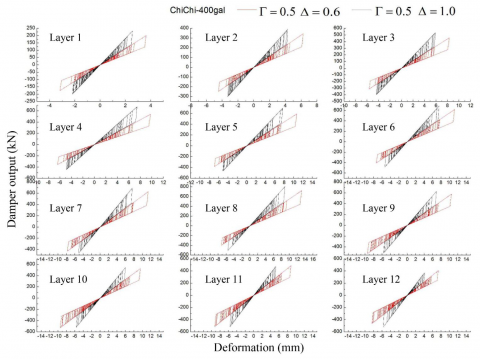 (3) The relatively large damper outputs appeared on layers 6-9, peaking on layer 8 (800kN). Comparing the damper outputs and deformations of the two parameter combinations, the damper deformation was greater under Γ=0.5, Δ=0.6.