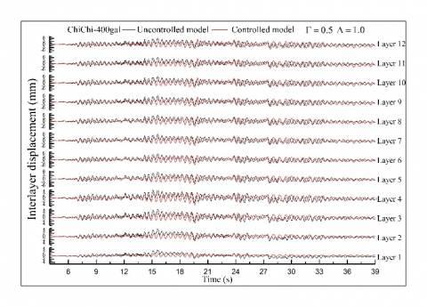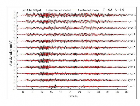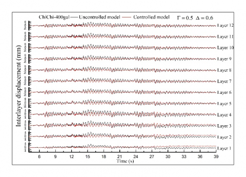 The seismic responses of the structure with damper (controlled model) and that without damper (uncontrolled model) were compared under the action of Chi-Chi seismic wave, whose peak acceleration was 400Gal.