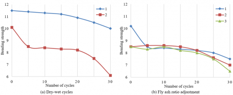 Figure 10(b) shows how the adjustment of fly ash ratio affects the bending strength of the composite. It can be seen that increasing the fly ash ratio could speed up the aging of the composite to a certain extent, but bending strength of composites with different fly ash ratios declined by the same trend. Comparatively, it is more effective to enhance the durability of the composite by increasing the fiber dosage.
