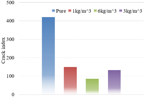 As can be seen from Table 9 and Figure 7, the crack indices of the composites with 1, 3, and 6kg/m3 fibers were 24.7%, 20.1%, and 23.7% that of pure cement matrix, respectively. The crack index gradually decreased with the growth in fiber dosage. The smallest crack index belonged to the composite with the fiber dosage of 6kg/m3. This composite has the strongest early shrinkage ability and crack resistance.