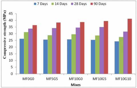 Figures 1 and 2 display the test results. It is demonstrated that there were no any challenges with the compressive strength development over time for mixes comprising FA and GP. The mixtures MF5G5, MF10G0 exhibited more compressive strength than the control mixture, but the mixtures MF10G5 and MF10G10 shown a lower compressive strength than the control mixture at 28 days. At ninety days, the mix MF10G10 exhibited the highest compressive strength value, exceeding the reference by nearly 13%. The next greatest values were recorded by mixes MF5G5, MF10G0, and MF10G5, which gained 5.5%, 6.3%, and 8.5%, respectively, over the identical reference mix.
