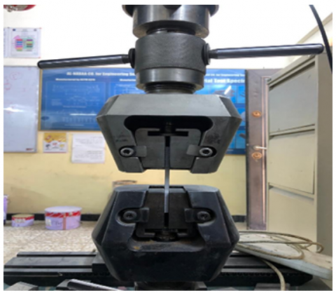 Tensile tests are performed by tensile strength machine (Figure 3) to determine the ultimate tensile strength of the samples, adhering to ASTM E8/E8M-15a standards. This testing is crucial for assessing the mechanical strength of the welds. Figure 4 depicts the precision cutting of the samples using a CNC water jet for subsequent analysis.