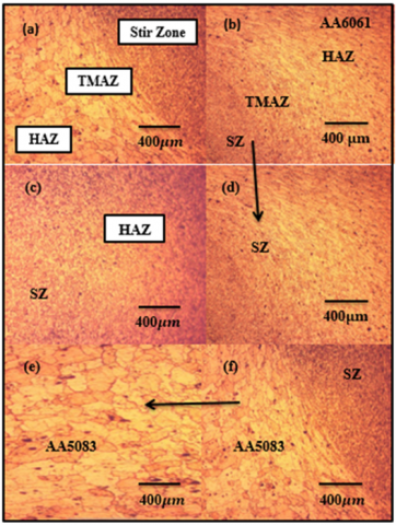 Microstructure analysis and Vickers micro-hardness tests are conducted to evaluate changes in the weld's microstructure across various zones: stir zone (SZ), thermo-mechanical affected zone (TMAZ), heat-affected zone (HAZ) and base metal (BM). These tests are crucial for understanding how the weld's characteristics vary across different regions and under different tool designs.