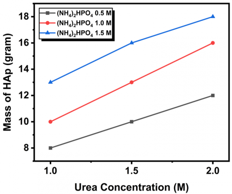 It is essential to consider the impact of urea and (NH4)2HPO4 concentration on the formation and properties of HAp. (NH4)2HPO4 has been identified as a consolidant that promotes the formation of calcium phosphate, particularly HAp [20]. Studies have shown that adding (NH4)2HPO4 to wet chemical precipitation methods leads to the precipitation of HAp along with other carbonated apatites [21]. Furthermore, research has explored the use of (NH4)2HPO4 for strengthening materials like chalk, indicating its potential to enhance the properties of HAp [22].