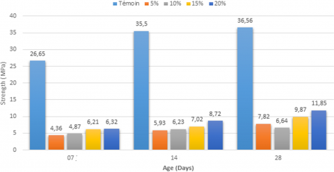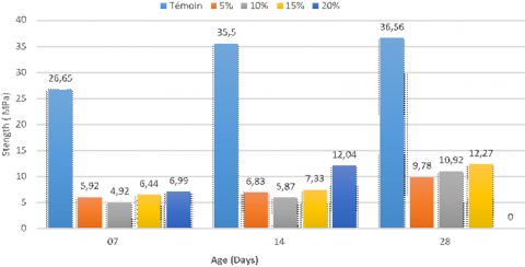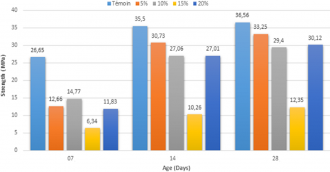 - Sludge: The incorporation of sludge in the mortar degrades its mechanical performance in compression, particularly at an early age and for high dosages. However, a 20% sludge dosage seems to allow the mortar to regain part of its strength in the longer term (28 days).