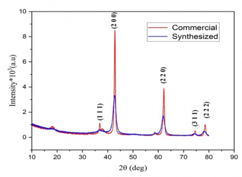 Figure 3 and Table 1 refer to X-RD detection for the commercial and synthases MgO nanostructure. Decrease in diffraction peaks when temperature increase, the date refers to nanoflakes MgO for both synthases and commercial, in anther hand FCC-structure (1 1 1), (2 0 0), (2 2 0), (3 1 1), and (2 2 2).