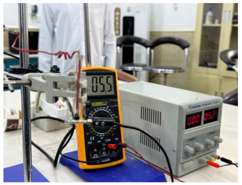 Figure 5 refer to conductivity experimental by used the conductivity devices (University of Hilla, medical physics laboratory), the result shows a highest working electrode conductor when applied deferent potentials with average (0.1 – 10) V. all result refers to 10% The rate of change in the voltage reading applied and recorded by the detector after passing through the surface of the electrode. This is a sufficient indication of the amount of homogeneity in the dough used and the absence of any amount of voltage being lost, which ensures accuracy in the reading during the various experiments of this study.