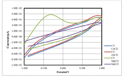 Figure 6. Cyclic voltammograms of MgO nanoparticles electrode in the presence of 0.1M of MgCl2, ZnCl2, CuCl2 and MnCl2 solutions
