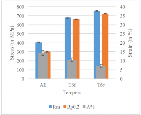The results of the chemical analysis (Table 1) show that the chemical compositions of the two bars, AE and T6f, are almost identical (with a slight difference in the Mg content) and “almost” in line with grade 7034. Only the Si content is slightly outside the standardised range of the Teal Sheets. This does not call the alloy or its possible properties into question.