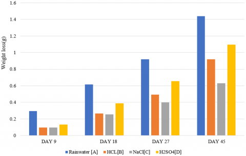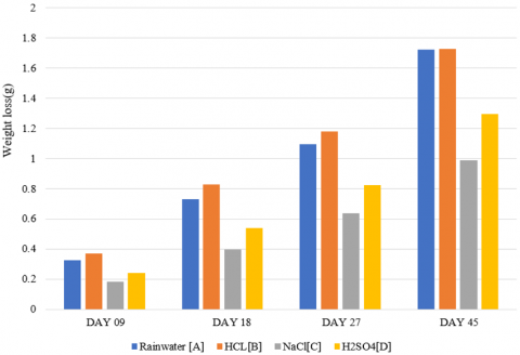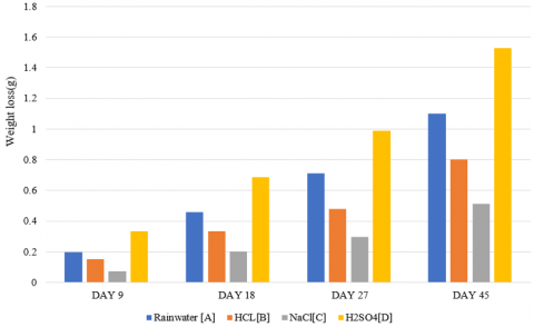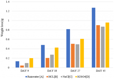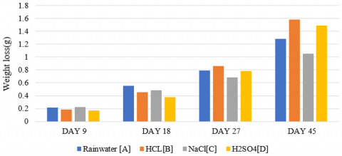 Figure 4(a) shows that 1.5g, 1.1g, and 0.8g of IMS2 (Imported Roofing Sheet 2) were lost in media D, A, and B respectively in 45 days. Within the same period, 0.5g of sample IMS1 was lost in medium C in 45 days. This is 48% less than 1.05g lost by IMS1 during the same period. It was observed in Figure 4(b) that sample ASS is highly prone to corrosion in medium A (rainwater). The weight loss increased by 79% in 25 days (between days 18 and 45). The sample also lost 1.10g of weight in medium D within 45 days which is the second height, followed by 0.92g in medium B and 0.63g in medium C which is the smallest.