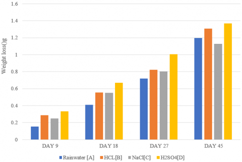 Medium[A]: Rainwater Medium[B]: HCl Medium[C]: NaCl Medium[D]: H2SO4 |