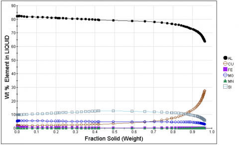 Simulations of Scheil-type solidification for Al-10Si alloys with progressive Mg additions (0.27, 3.26, and 5.26 wt.%) revealed systematic solute redistribution during solidification (Figure 3). The aluminum content in the remaining liquid displayed a gradual reduction from roughly 86 wt.% at the start of solidification to about 65–70 wt.% as it got closer to being finished. Copper, initially stable, exhibited a gradual increase followed by a sharp rise to ~25–28 wt.% in the final 5–10% of liquid. Magnesium demonstrated significant segregation, increasing from ~0.3 wt.% in the base alloy to ~6–8 wt.% at 95% solid fraction under low Mg conditions, with further amplification observed in alloys containing 3.26 and 5.26 wt.% Mg. Silicon remained relatively stable at 11-13 wt.%, consistent with its role in Al-Si eutectic formation, while Fe and Mn concentrations remained low but showed tendencies to increase at high solid fractions, suggesting potential formation of Al-Fe-Si intermetallics. These results indicate that increasing nominal Mg content not only enhances Mg segregation but also modifies the partitioning behavior of Cu and Si, ultimately promoting a refined Al-Si-Mg-Cu eutectic microstructure following die casting of high pressure (HPDC).