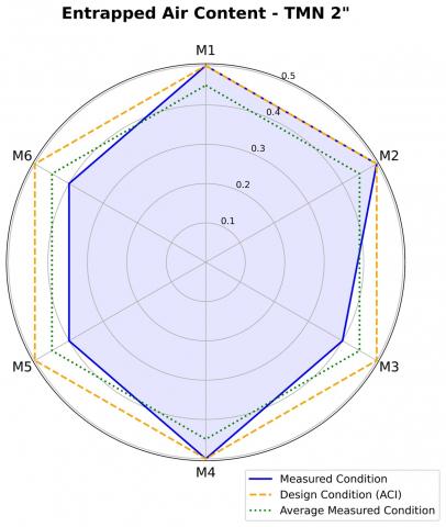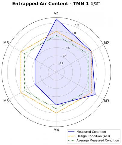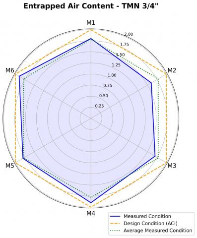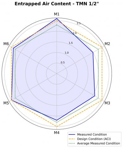 In this investigation, the variations of the percentages of entrapped air obtained were measured and compared with those established in the ACI method table for each TMN of the coarse aggregate. Consequently, an updated table of entrapped air percentages was generated to align with the particular conditions of the study area.