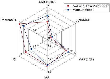 The application or predictions from the conventional code-based approach such as ACI 318-19 and AISC 360-16 [20, 21] show better correlation with the experimental values compared to the predictions from Mansur nonlinear concrete constitutive model for both initial cracking and failure load cases, with root mean square error (RMSE) of 16.50 kN, mean average percentage errors (MAPEs) of 9.98%, higher coefficients of determinations, R2 = 0.7580, and high Pearson’s correlation, R = 0.9719. The code-based approach is conservative of calibration as it over-predicted the capacity reasonably within design tolerances.