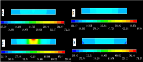 Figure 7. Temperature contours during FSW of AL 7075-T651 using moving heat source; A at 155 Sec, B at 221 Sec, C at 249.3 Sec, D at 286.8 Sec