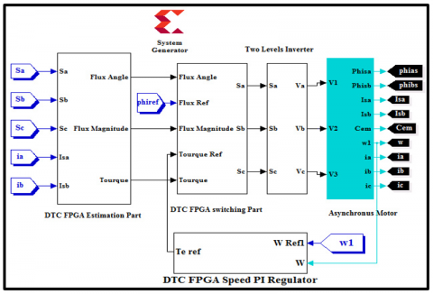 In fact, for verification and development of the algorithms of estimators in FPGA circuit we will use the modeling tool known as XSG developed by Xilinx intended for MATLAB / SIMULINK. The main role of the SXG tool is to transform the DTC model into hardware format for implementation on FPGA. Then it generates VHDL code without any difficult programming. Indeed, the implementation time of this algorithm turns out to be reduced.