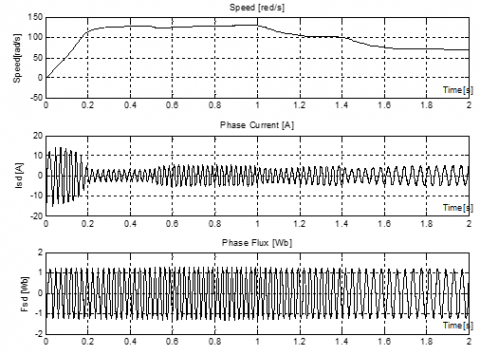 Figure 20. Behavior of induction motor speed, phase currents and phase flux