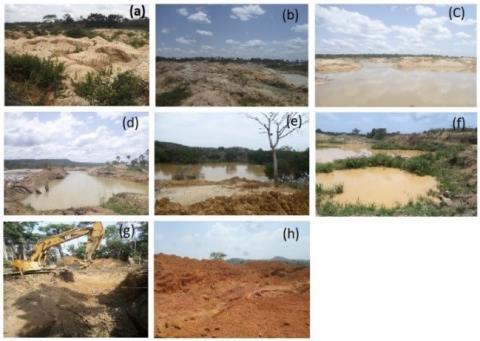 The study area is subjected to semi-mechanized artisanal mining. The impact is significant in the especially in the gold-rich Lom zones where vast areas are being disturbed. At all mining sites, vegetation cover has almost disappeared and no reforestation measures are being implemented (Figure 3a, b).