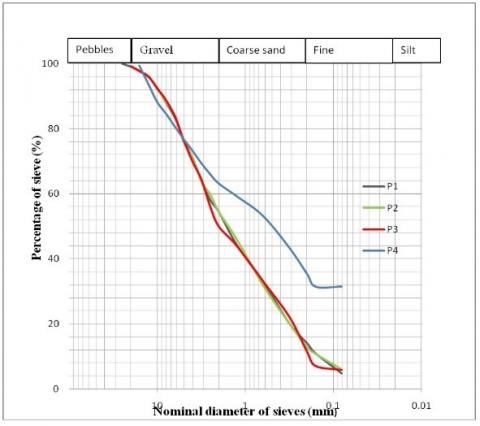 The particle size analysis (Figure 4) provides information on the main particle size parameters of the samples, namely the HAZEN coefficient and the curvature coefficient; the fineness module of different samples and the composition of particle. It follows that samples P1, P2 and P3 have a uniformity coefficient of 186.6, 18.6, 17.5 respectively and a curvature coefficient of 5.95, 0.148 and 0.142. The finess module of the samples P1, P2, P3 and P4 are respectively 3.57; 3.55; 3.61 and 2.7. The materials consist of various pebbles, gravel, coarse sands, fine sands and other materials represented in the form of traces.