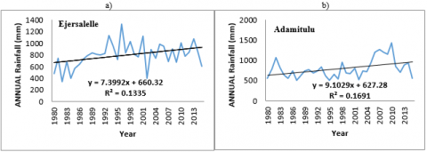 The previous studies by Legesse et al. [5] and Seyoum et al. [8] noted that human abstraction (industrial and agricultural) from the lakes and the tributaries in the Ethiopia Central Rift Valley started in the early 1980s and have increased with time. Therefore, the overall aim of the present study is to analyse the variability and trends of rainfall at monthly, seasonal, and annual time scale in the period of 1980-2015 (36 years). Additionally, the spatial distribution through interpolation mapping was made using Geographic Information Systems (GIS). An understanding of trends and variability of precipitation entering the catchments would be provided useful information for the planning, development, and management of water resources in the study area.