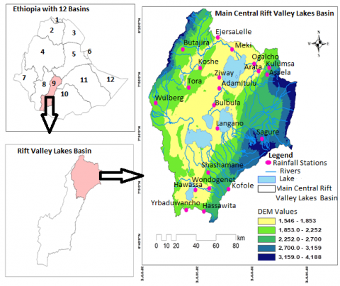 Figure 1. Location map showing the main central rift valley lakes basin with the five lakes and their catchments, rainfall stations, and rivers