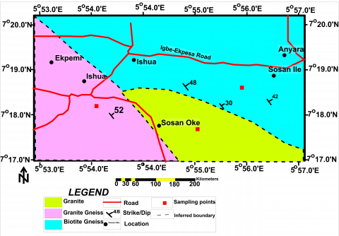 The study area lies within the Precambrian basement complex of Nigeria which is situated within the Pan-African mobile belt of West Africa and Congo Craton. This area falls between latitudes 7° 25´ N to 7° 32´ N and longitudes 5° 53´ E to 5° 58´ E and is accessible by roads and footpaths, Figure 1. The terrain is gently undulating and few areas of the landscape can be viewed at a glance because of thick vegetation. The three major lithologies mapped based on field observation consists of mixed suits of granites, granite gneisses and biotite gneisses. The biotite gneisses occupy the western part of the study area where they form ridges and undulating highland at the west end of the area. The granite gneisses occur as massive and extensive bodies trending from part of the north-west end and to the north-east end, representing about 50% of the entire study area. They outcropped as domes and high hills. They are leucocratic, medium-coarse grained and are partially weathered. Granites, on the other hand occurs as low lying bodies but partly buried with overburden and covers about 15% of the study area. This area is situated in the tropical rainforest belt of the country.