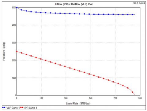 Production goes from 4365.34 STB/d at an injection pressure of 2500 psi, then when the injection pressure reaches 3000 psi, production rises to 4382.82 STB/d, and finally when the injection pressure reaches 3500 psi, production increases to 4404 STB/d. The well produces very little gas and almost no water. The variation in injection showed that as the injection rate increased, so did production. This allowed us to choose a jet pump injection rate of 3500 psi and a total production of 4404 STB/d from the two reservoirs through Well Y as shown in Figure 8.