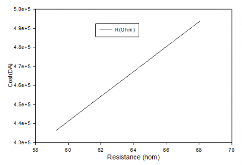 Figure 2 shows the variation of the cost of installation according to the electrical resistance, the increase of the resistance causes the increase of the cost of the autonomous system. Figures 3, and 4, 5 show the irradiation effect during the day on the number of solar panels and the number of batteries, which increase when Ir = 5 kw/d and decrease when Ir = 8 kw/d, so solar irradiation causes an inversely proportional effect with photovoltaic sizing.