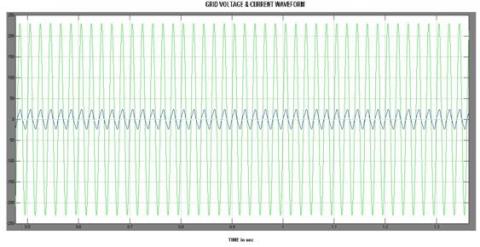 The Figure 13 shows grid voltage and current waveform, it indicates both are in phase. Thus the near unity power factor operation is achieved. This system looks likes STATCOM device.