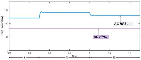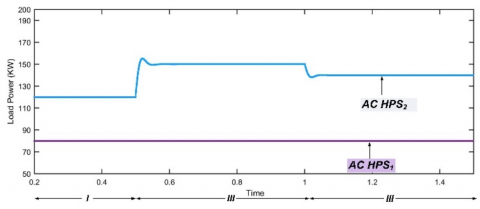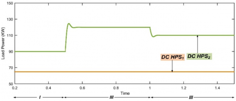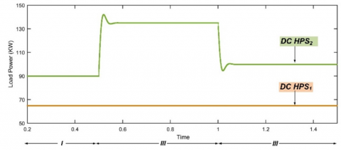 Figure 12 shows load power variations with time in case-I. In state-II and state-III, 30KW and 20KW additional load is connected at HPS2 respectively with no variation in load on HPS1. With conventional control the deviation in voltage of HPS2 are observed as -30V and -20V respectively for state-II and state-III which is beyond prescribed limit. With overloading of 33.33% and 22.22% on HPS2 in state-II and state-III respectively multi-voltage controller shares additional loading among HPS1 and HPS2 in proportion to 42% and 58% respectively.